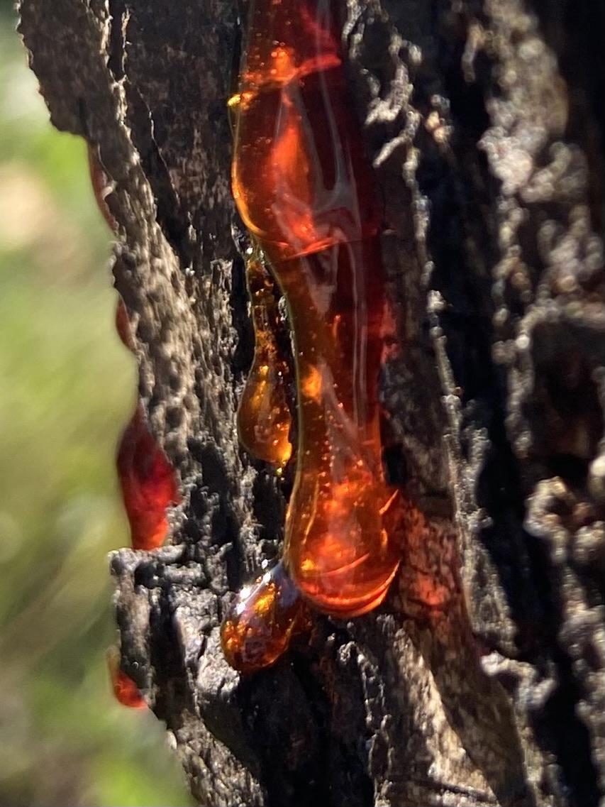 Thick strands of orange and red tree sap on the side of an apricot tree, brilliant in the sun