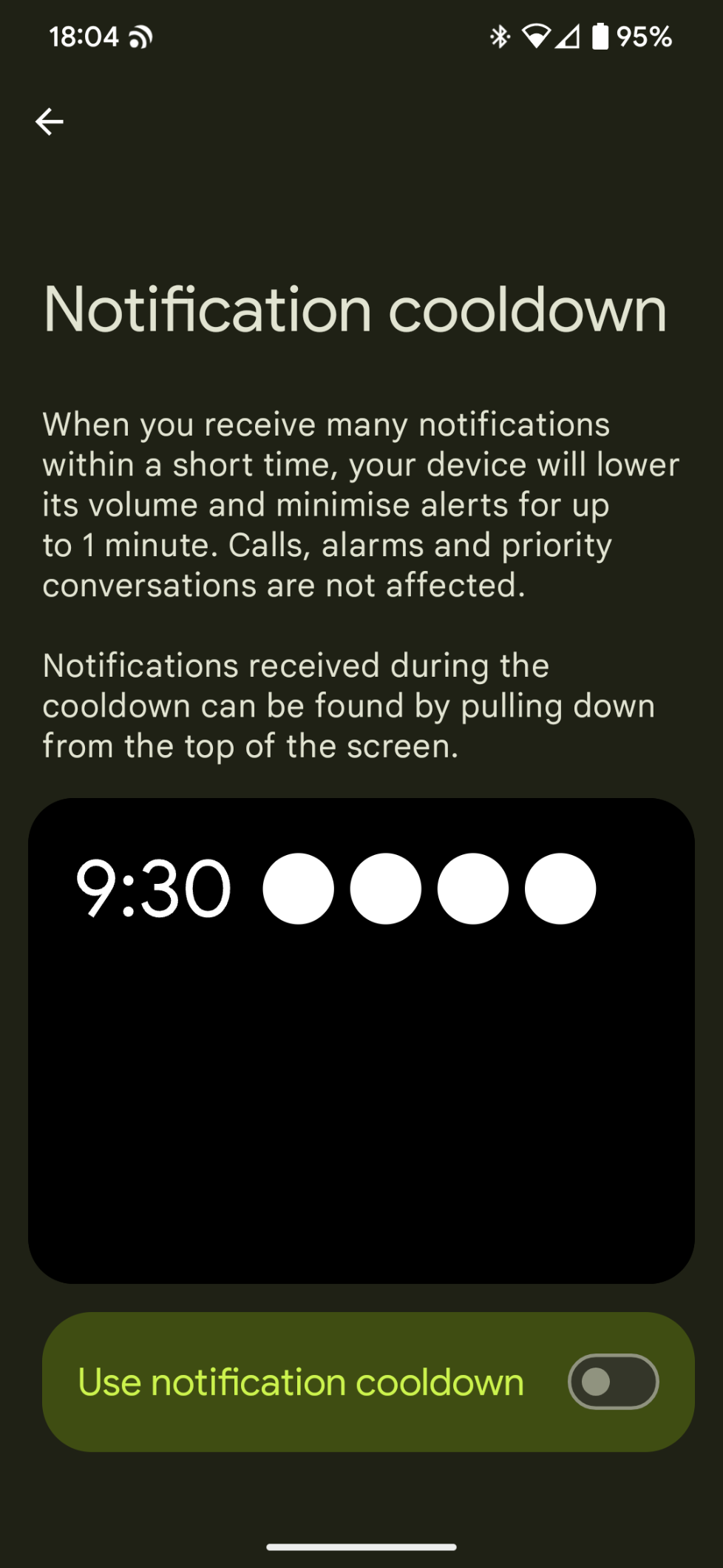Screenshot of Android 16 settings screen, text reads Notification cooldown When you receive many notifications within a short time, your device will lower its volume and minimise alerts for up to 1 minute. Calls, alarms and priority conversations are not affected. Notifications received during the cooldown can be found by pulling down from the top of the screen.