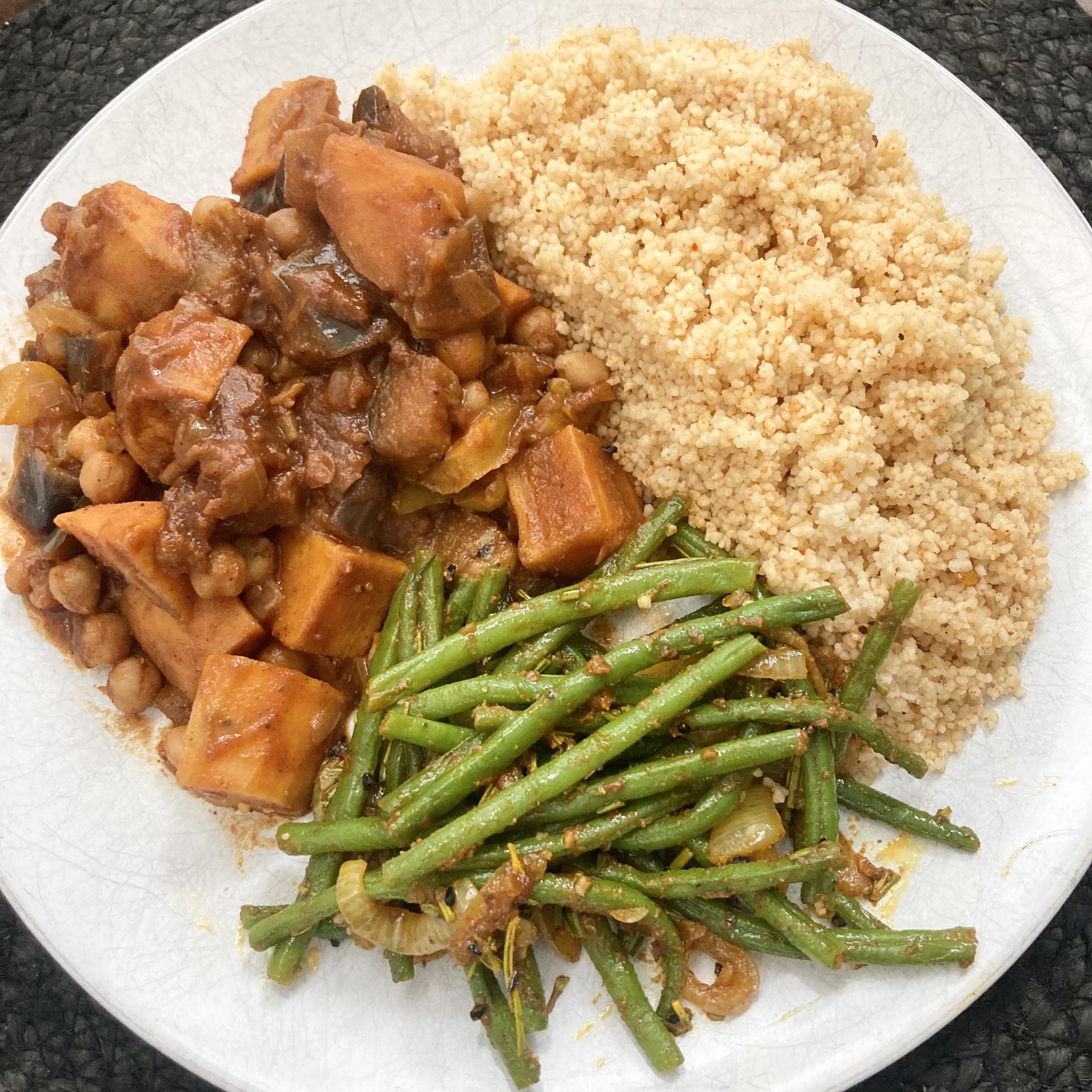 Overhead shot of a plate of food in three parts. To the top right a pile of cous cous flecked with harissa spice. Bottom right are green beans and onions that have a rosemary, cumin, turmeric and nigella seed blend. Top left is a tagine stew, deep orange with chunks of sweet potato, aubergine, chickpeas and dates.