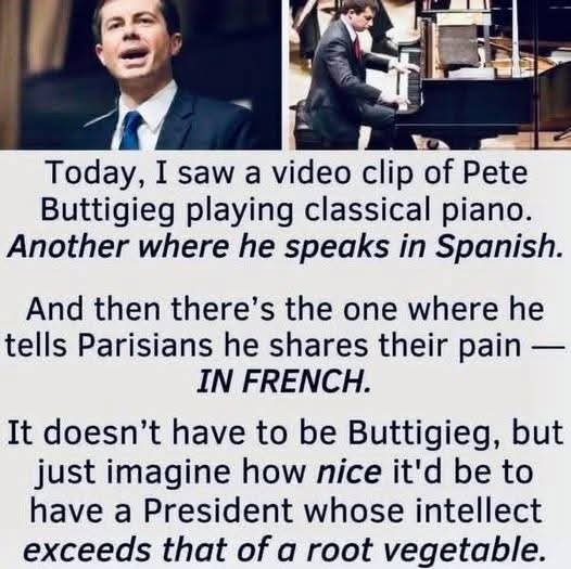 Today, I saw a video clip of Pete Buttigieg playing classical piano. Another where he speaks in Spanish. And then there's the one where he tells Parisians he shares their pain - IN FRENCH. It doesn't have to be Buttigieg, but just imagine how nice it'd be to have a President whose intellect exceeds that of a root vegetable.