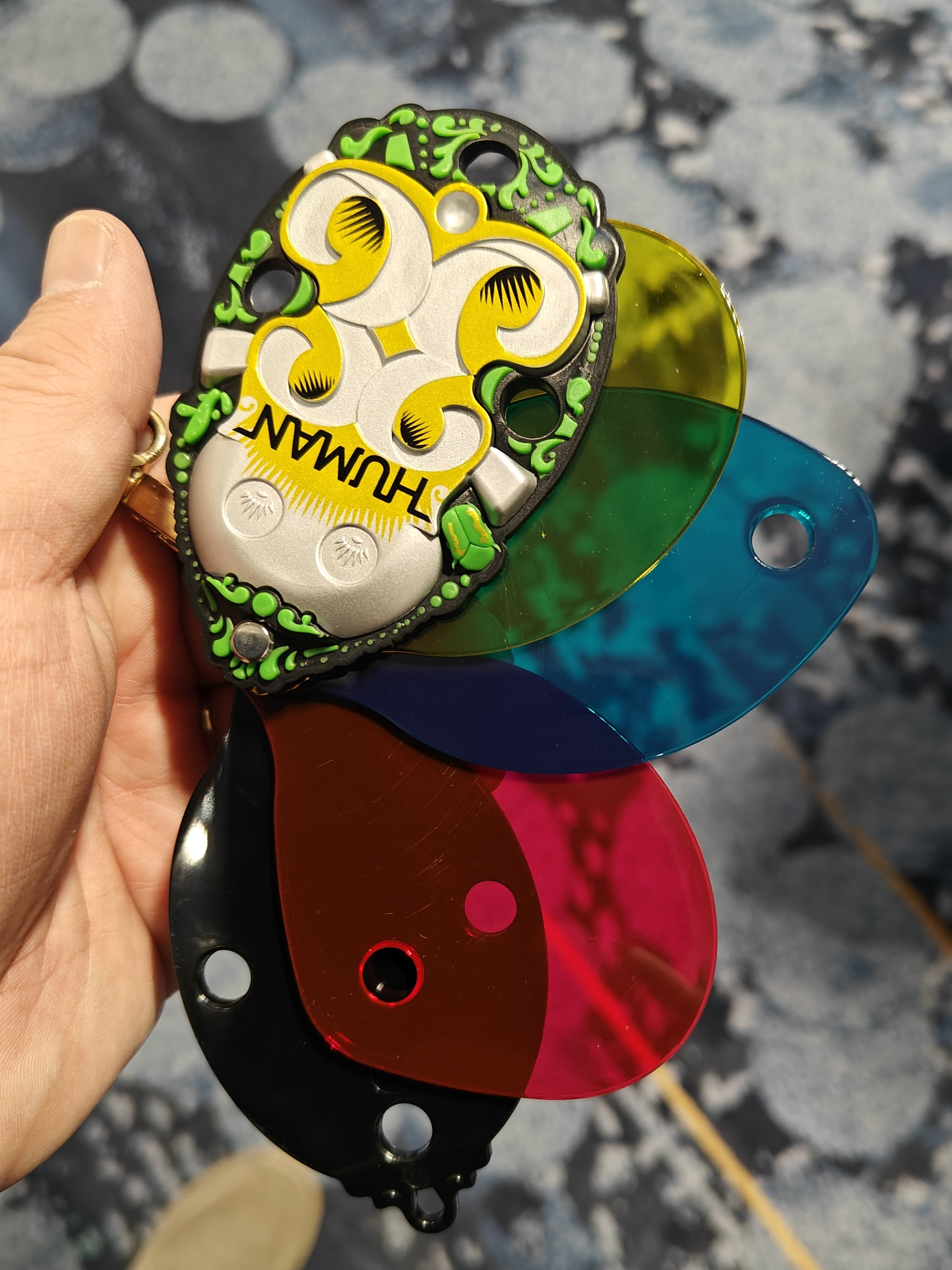 Defcon 33 human badge with red, blue, yellow plastic pieces inside splayed out.