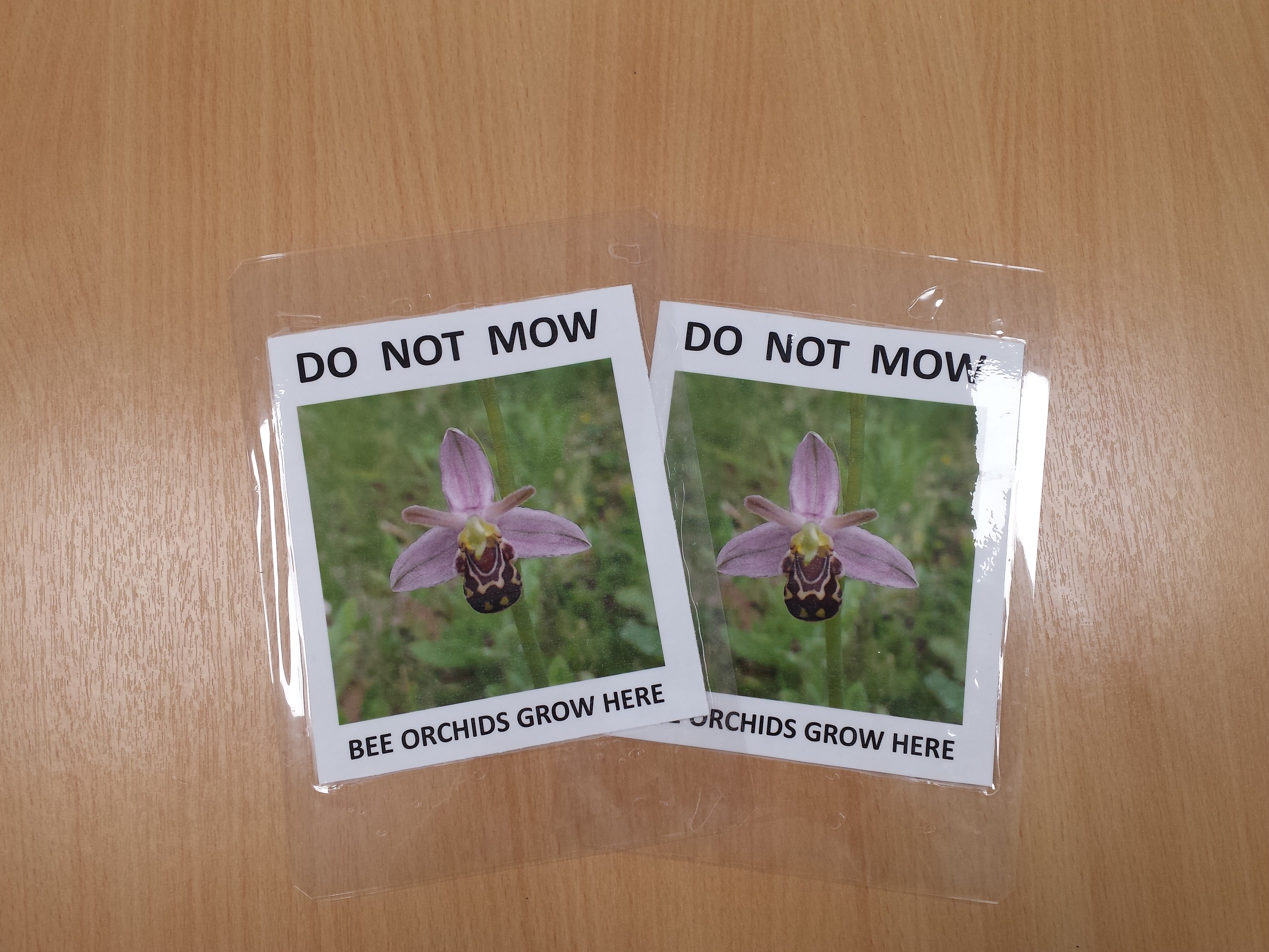 Photo of two laminated posters. "DO NOT MOW. BEE ORCHIDS GROW HERE." With a photo of a bee orchid flower.