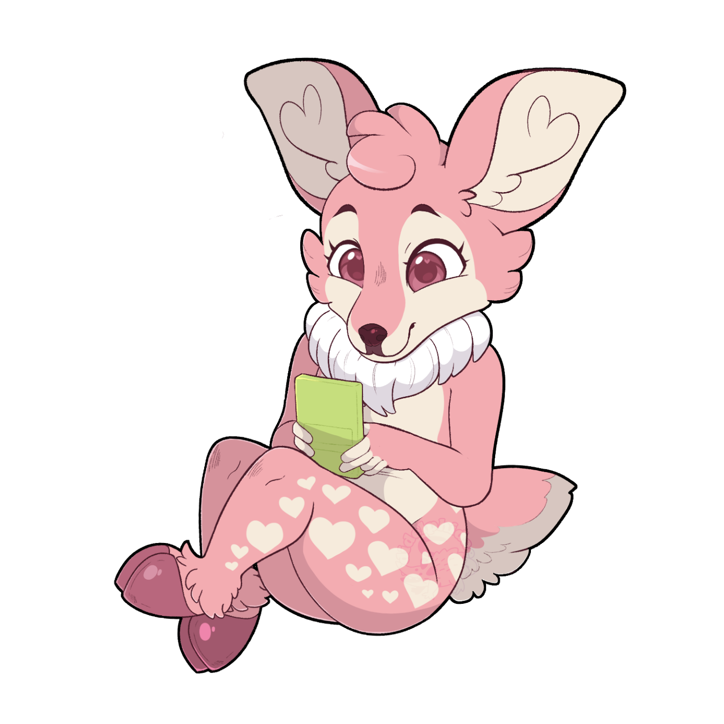 Pink deer sitting down playing a green gameboy color. She has heart spots in her fur, hearts in her eye shine and hearts in her ear fluff