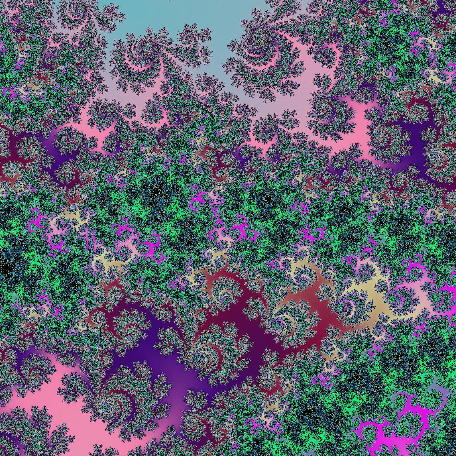 A render of the mandelbrot set using randomised colours. The centre point is -0.5663901647944266 + -0.4647571652398558i and we are zoomed to 4.3546918137e+09 magnitude.