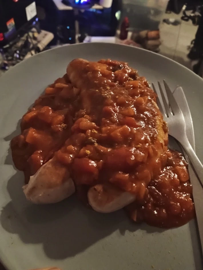 Closeup of Currywurst on a plate.