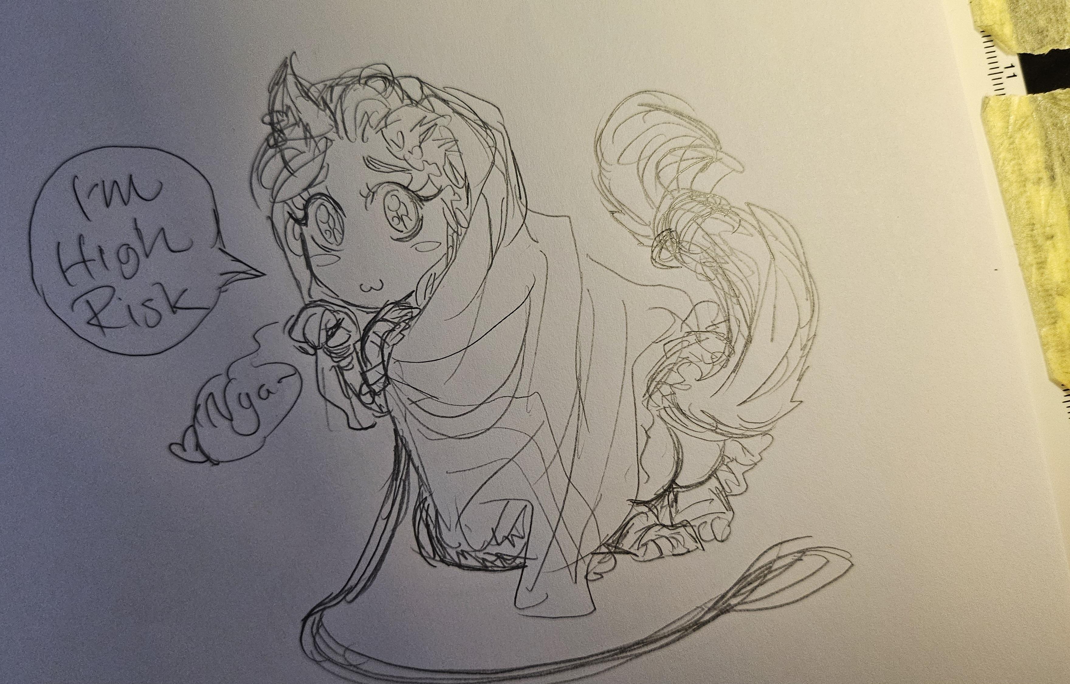 Rough sketch of a chibi catgirl in kink gear, under a blanket being like "I'm high risk, nya" while looking very cosy