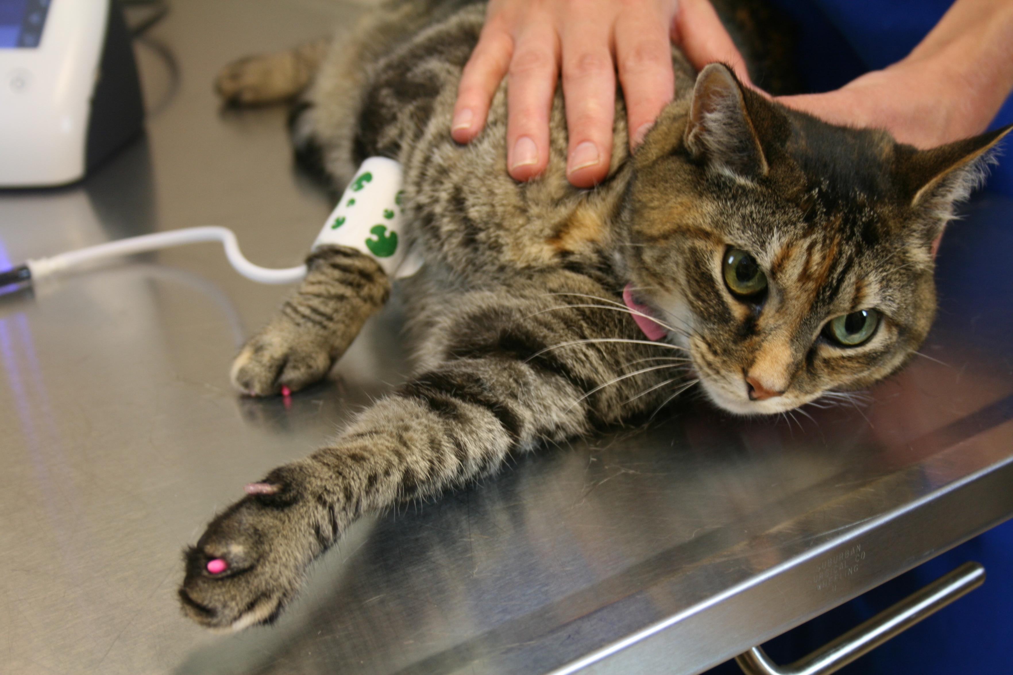 A tabby cat lying on an exam table with a concerned expression. A person is holding it while it gets its blood pressure taken through a white cuff with green paw prints wrapped around one of its front legs.
