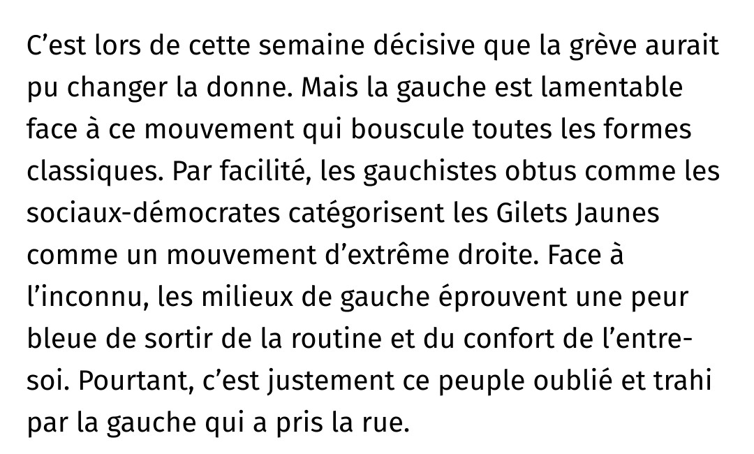 Extrait de l'article de Contre Attaque à propos des manifs des Gillets Jaunes, mises en relation avec celles à venir du 10 septembre : "C’est lors de cette semaine décisive que la grève aurait pu changer la donne. Mais la gauche est lamentable face à ce mouvement qui bouscule toutes les formes classiques. Par facilité, les gauchistes obtus comme les sociaux-démocrates catégorisent les Gilets Jaunes comme un mouvement d’extrême droite. Face à l’inconnu, les milieux de gauche éprouvent une peur bleue de sortir de la routine et du confort de l’entre-soi. Pourtant, c’est justement ce peuple oublié et trahi par la gauche qui a pris la rue."