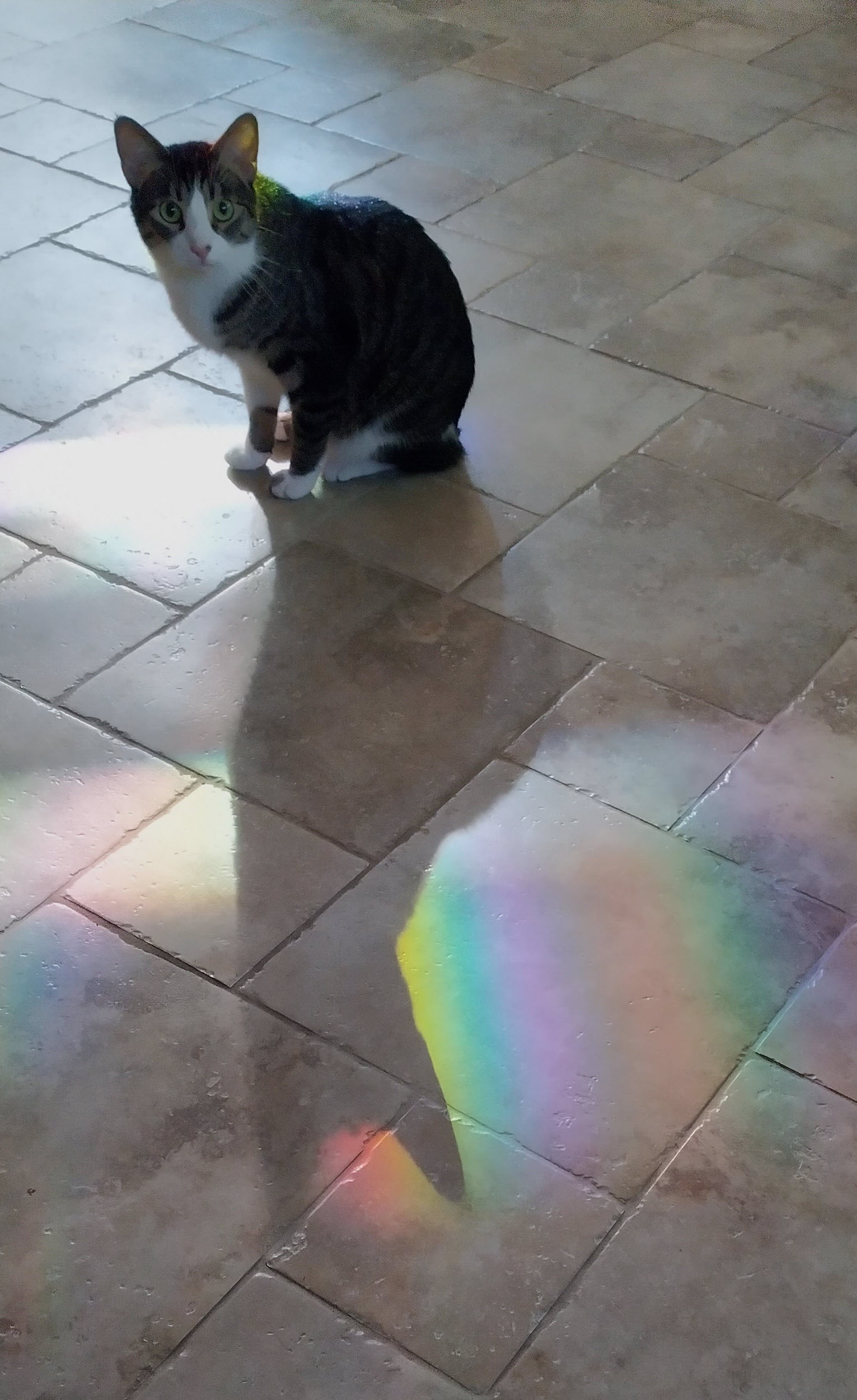 A cat looking at you while sitting on a tile floor. Next to his shadow is a rainbow of light beams.