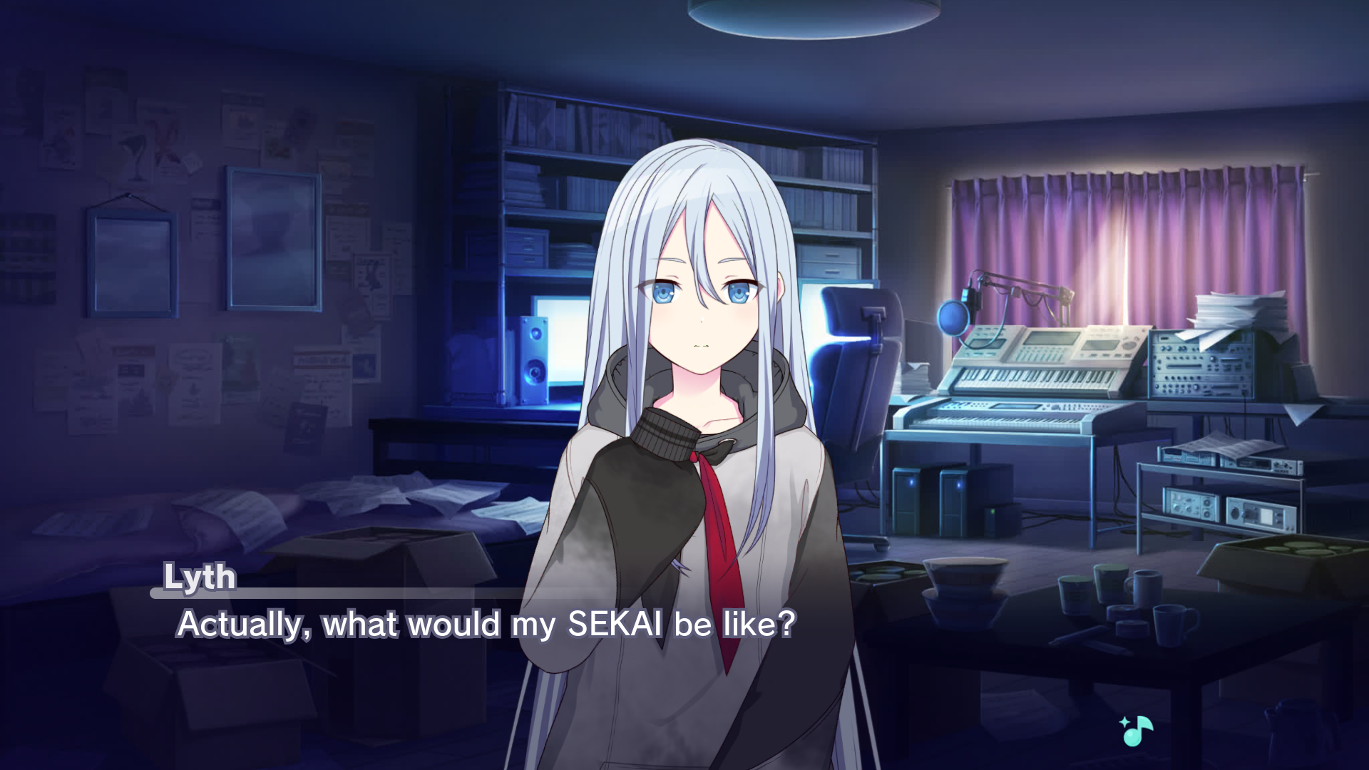 Lyth continues her late night monologue with "Actually, what would my SEKAI be like?"