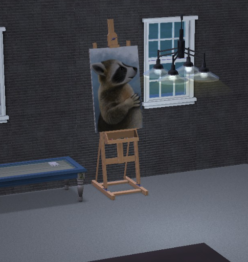 Screenshot from The Sims 2 game. There is a gray brick wall, with white-framed window and short glass table visible. In central part there is painting canvas, with picture created by one of characters. It's painting of standing raccoon on blue background.