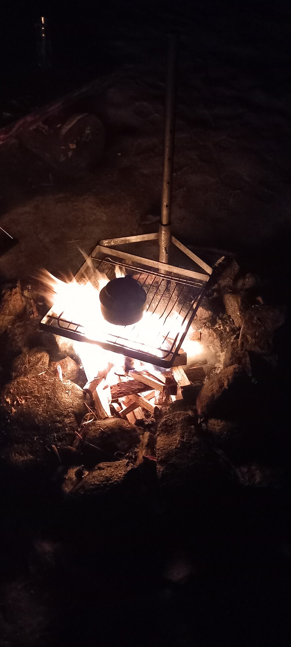 A coffee pot on a grill above camp fire. Darkness all around the fire. February evening in Finland.