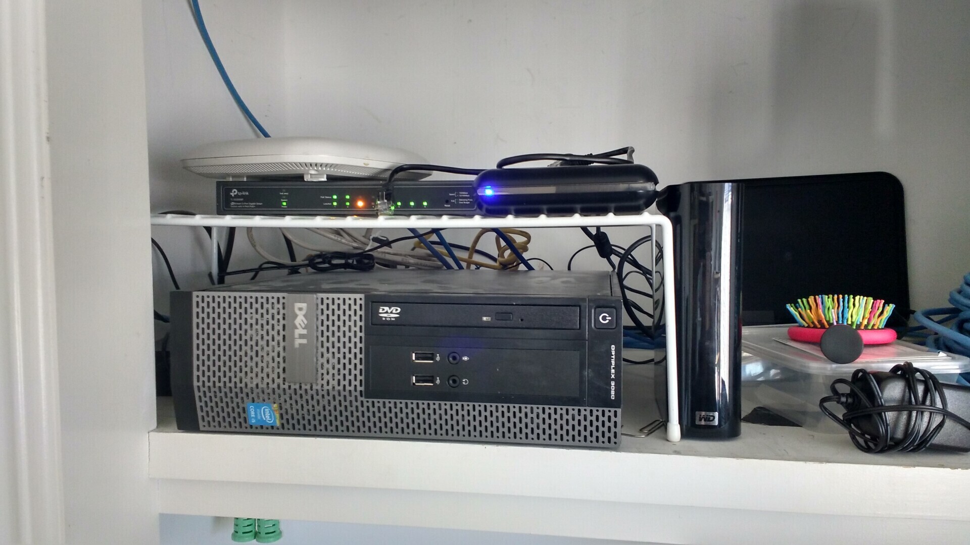 "miranda" - a compact silver and black Dell business desktop sitting under a wire rack. On top of the rack sits a small ethernet switch, WiFi access point, and an external hard drive. Next to the rack sits another external hard drive. Also visible is a pink hair brush with rainbow bristles.