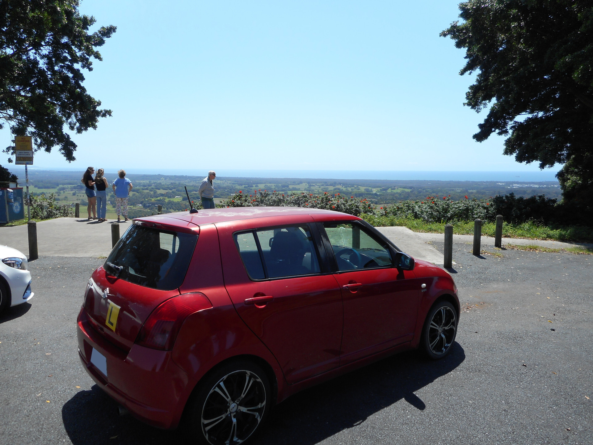 A red Suzuki Swift, parked in nearly the same spot as the ZZR. Notable details include the large CSA rims and some paint sunburn.