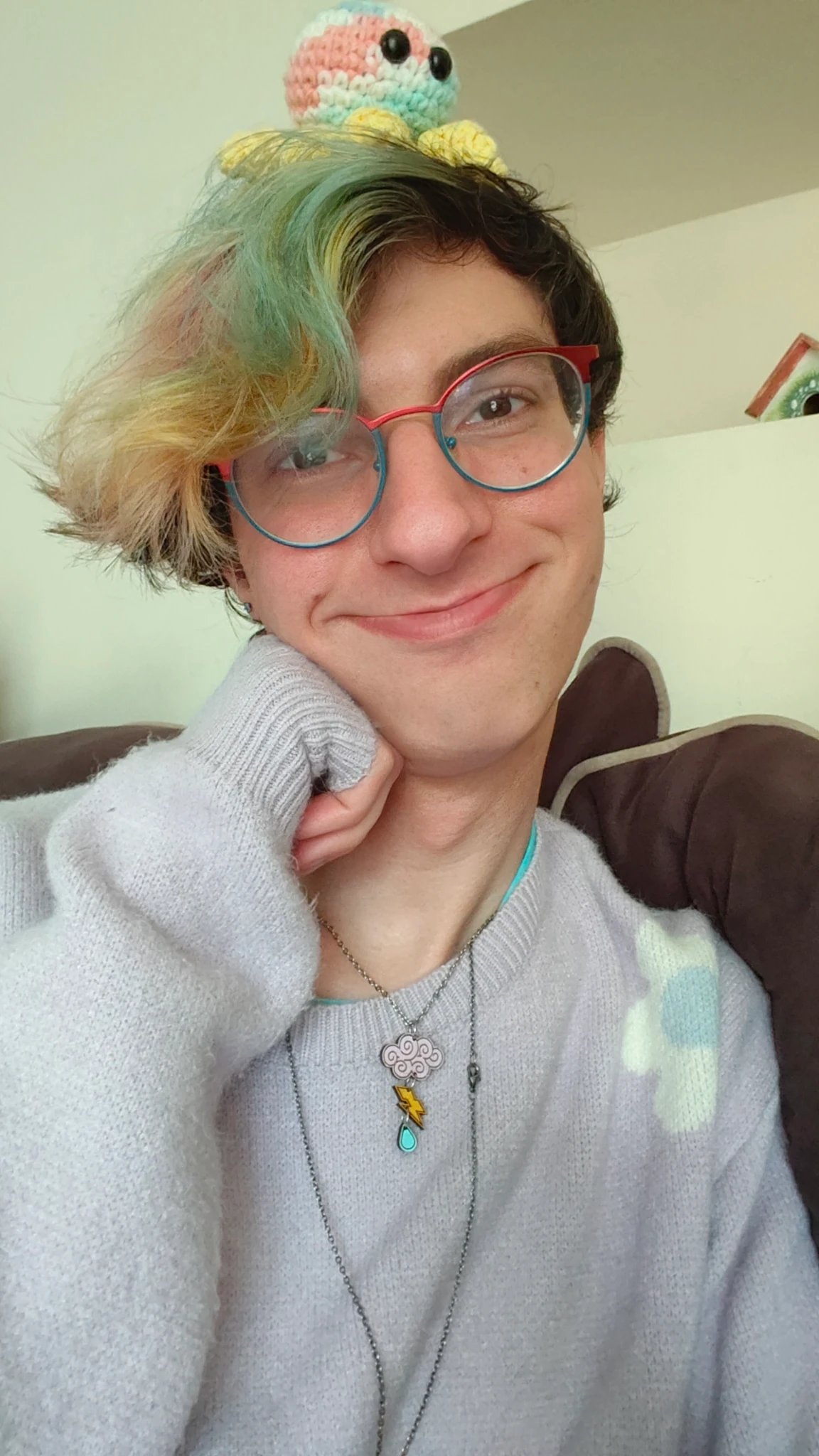 A girl with short rainbow hair and an octopus on her head. She's wearing a lavender sweater with flowers on it and smiling.