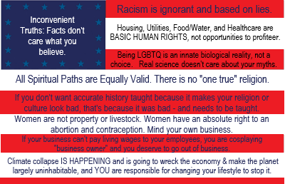 An American Flag graphic with the following words superimposed: In the blue starry field: Inconvenient Truths: Facts don't care what you believe. On the red and white stripes, in order: Racism is ignorant and based on lies. Housing, Utilities, Food/Water, and Healthcare are BASIC HUMAN RIGHTS, not opportunities to profiteer. Being LGBTQ is an innate biological reality, not a choice. Real Science doesn't care about your myths. All Spiritual Paths are Equally Valid. There is no "one true" religion. If you don't want accurate history taught because it makes your religion or culture look bad, that's because it was bad - and needs to be taught. Women are not property or livestock. Women have an absolute right to an abortion and contraception. Mind your own business. If your business can't pay living wages to your employees, you are cosplaying "business owner' and you deserve to go out of business. Climate collapse IS HAPPENING and is going to wreck the economy & make the planet largely uninhabitable, and YOU are responsible for changing your lifestyle to stop it.