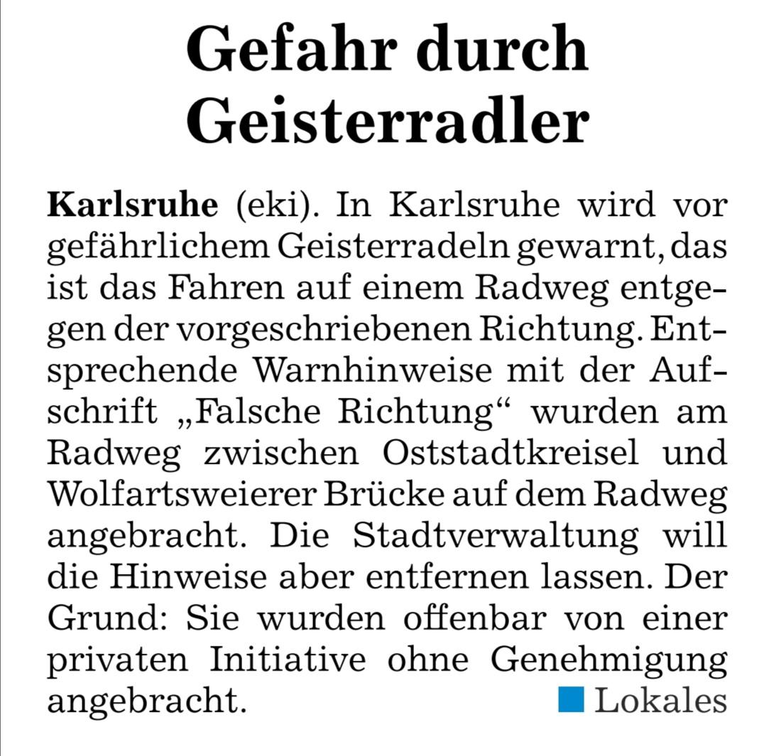 Zeitungsmeldung: Gefahr durch Geisterradler Karlsruhe (eki). In Karlsruhe wird vor gefährlichem Geisterradeln gewarnt, das ist das Fahren auf einem Radweg entgegen der vorgeschriebenen Richtung. Entsprechende Warnhinweise mit der Aufschrift „Falsche Richtung“ wurden am Radweg zwischen Oststadtkreisel und Wolfartsweierer Brücke auf dem Radweg angebracht. Die Stadtverwaltung will die Hinweise aber entfernen lassen. Der Grund: Sie wurden offenbar von einer privaten Initiative ohne Genehmigung.