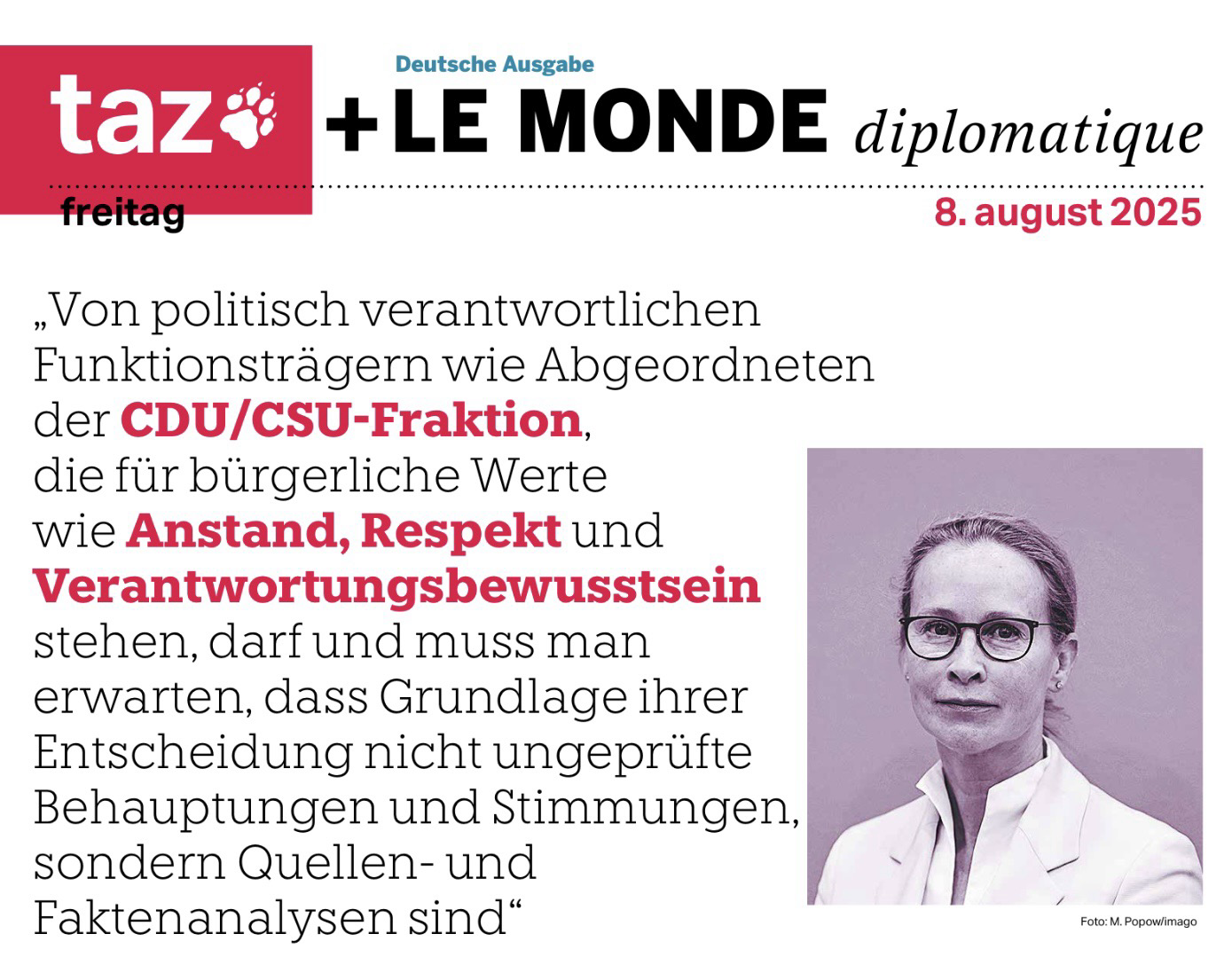Der Titel der Taz vom 8. August 2025 mit einem Bild von Frauke Brosius-Gersdorf. „Von politisch verantwortlichen Funktionsträgern wie Abgeordneten der CDU/CSU-Fraktion, die für bürgerliche Werte wie Anstand, Respekt und Verantwortungsbewusstsein stehen, darf und muss man erwarten, dass Grundlage ihrer Entscheidung nicht ungeprüfte Behauptungen und Stimmungen, sondern Quellen- und Faktenanalysen sind"