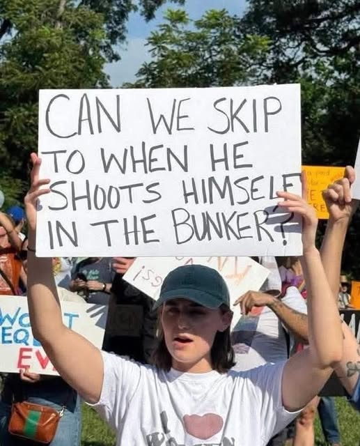 The picture is of a protester with a sign reading, "Can we skip to the part where he shoots himself in the bunker?"