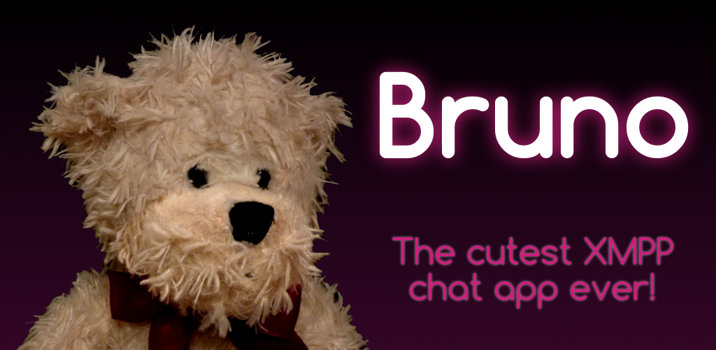 Feature graphic for a chat app: a plush bear on the left, white and pink text on the right: Bruno - the cutest XMPP chat app ever!