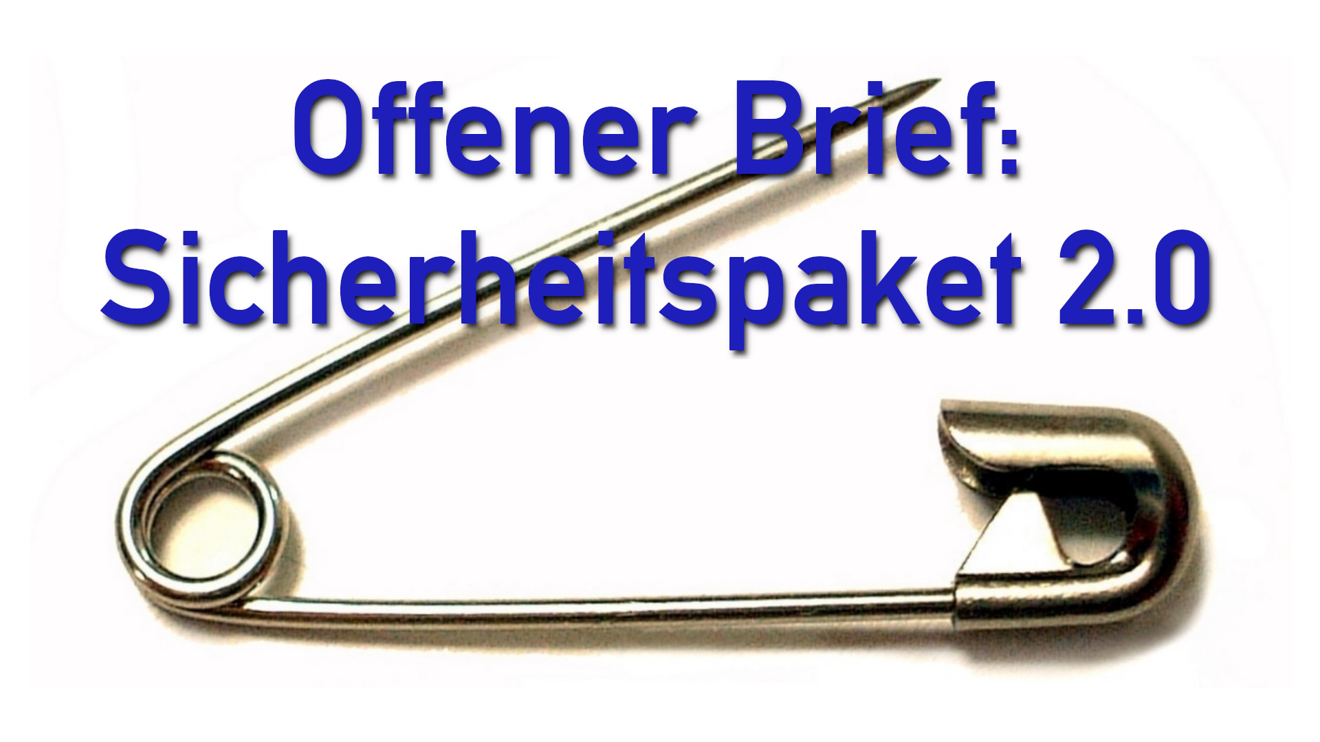 Das Bild einer offenen Sicherheitsnadel, darΓΌber der Text: Offener Brief: Sicherheitspaket 2.0