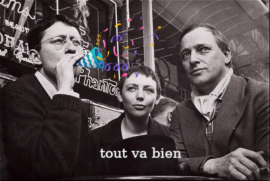 Photo de groupe en noir et blanc grossièrement détournée réunissant les situationnistes Guy Debord, Michèle Bernstein et Asger Jorn assis à la terrasse d'un café parisien à la fin des années 50. #Everything's fine