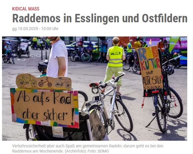 Screenshot EZ Onlineartikel: Kidical Mass Raddemos in Esslingen und Ostfildern gg 15.05.2025 - 10:00 Uhr <Bild einer RAddemo, Schilder u.A. "Ab aufs RAd aber sicher" "Radkultur statt Autospur"> Verkehrssicherheit aber auch Spaß am gemeinsamen Radeln: darum geht es bei den Raddemos am Wochenende. (Archivfoto) Foto: SDMG