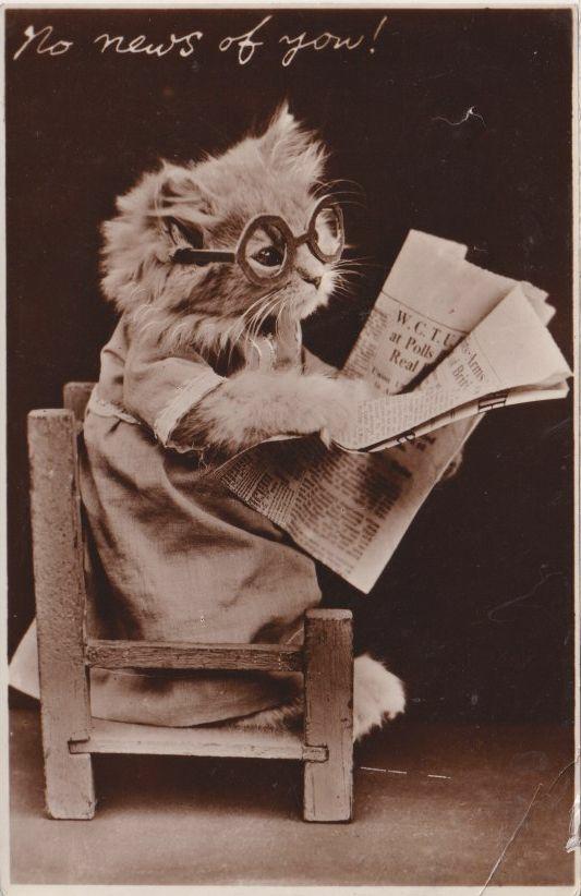 A black and white photo of a cat sitting on a wooden chair and reading a newspaper wearing eyeglasses. A postcard dated to 1936.