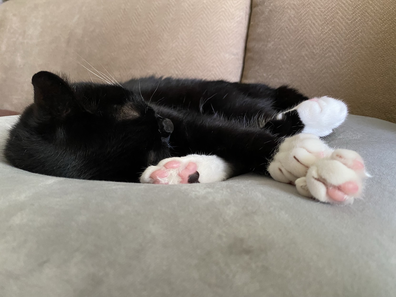 A sleeping black and white cat is curled up on a soft surface, with its paws visible and resting comfortably.