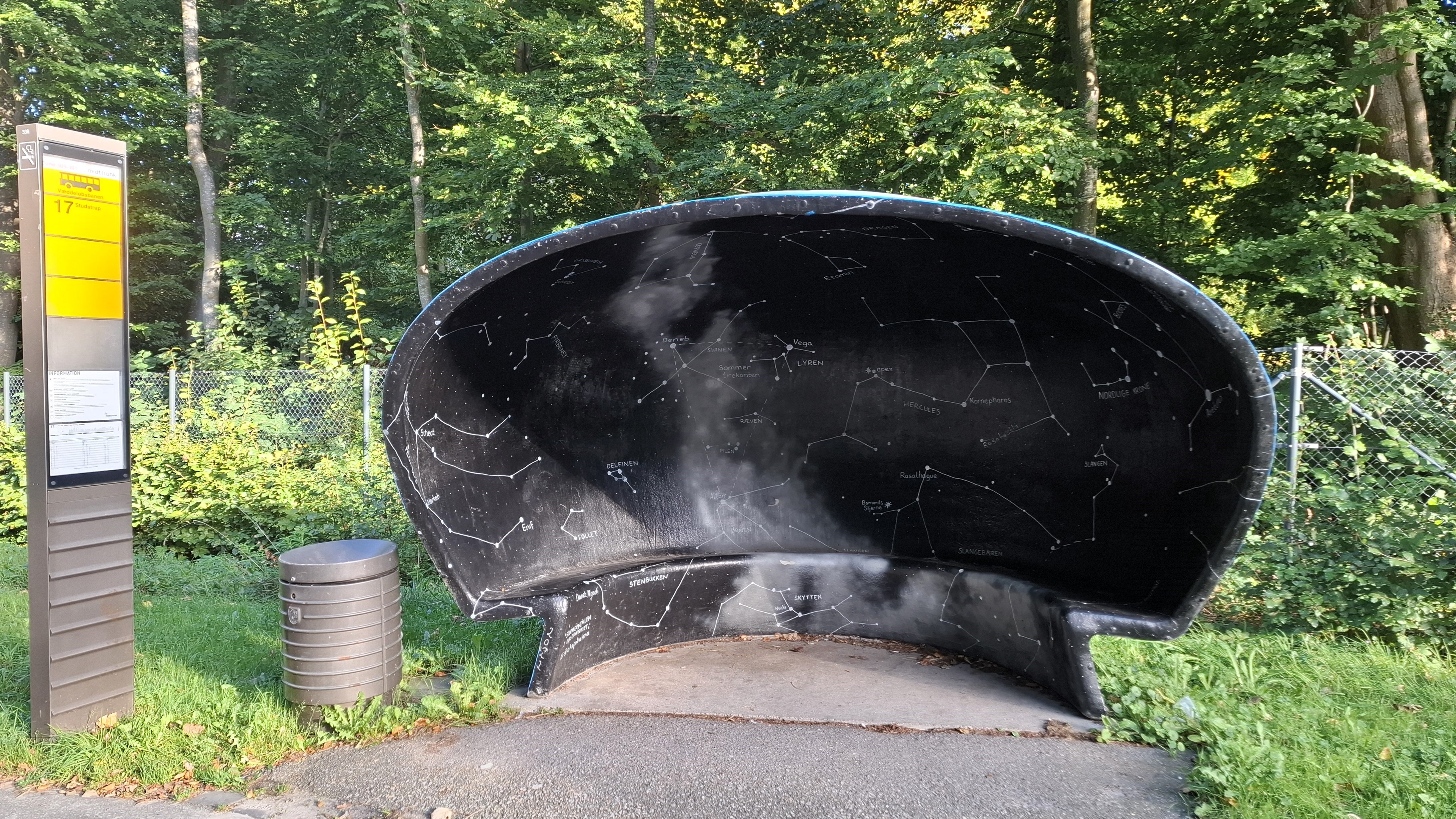 Aarhus. On the road outside the Ole Rรธmer Observatory, named after another famous Dane, Carl Nielsen. A broad clear road in Kongelunden, the Royal Woods, with trees on either side. Looking straight at the bus shelter, one of the cityโs iconic mushroom-shaped bus shelters designed in the 1960s by furniture designer Poul Cadovius. A low concrete mushroom-shaped shell with standing room and a little bench inside. The council commissioned artists to paint them with local motifs. Artist Ekaterina Poliakova painted the night sky in this one. As you wait for the bus, you are surrounded on three sides and above by a black night sky with a map of the stars and constellations and galaxies, their names written beside them. Outside, the shelterโs shell is painted like a day sky โ light blue with fluffy white clouds.