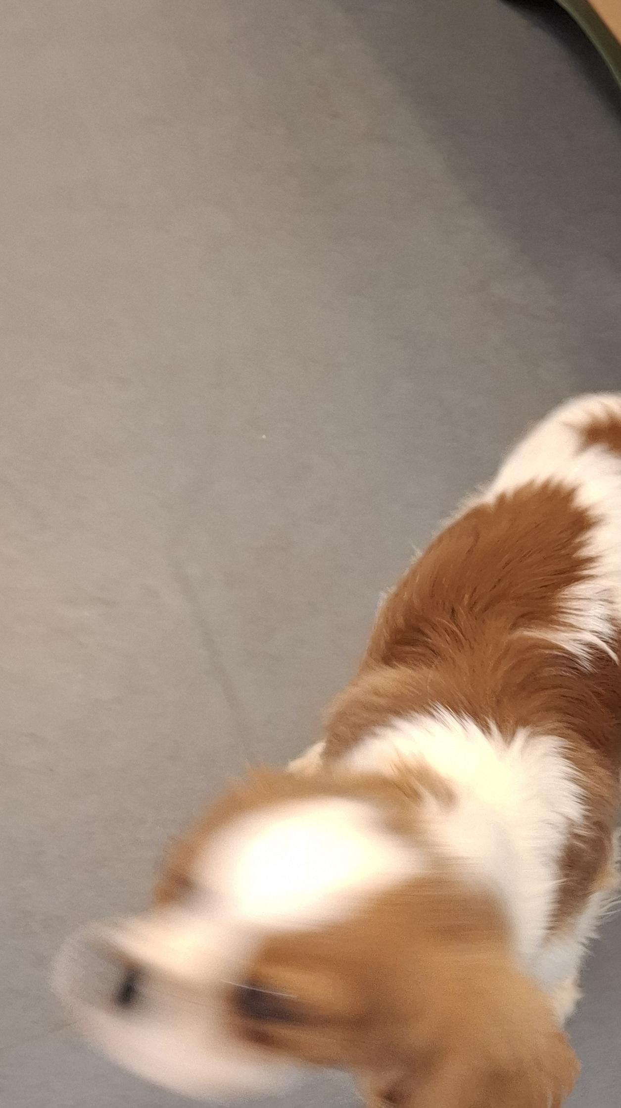 Same Alt Text all photos. A fuzzy blurry pic of a bit of a gorgeous little white-and-brown King Charles Cavalier spaniel with a boring grey office floor and desk background. Photo taken with permission, model's labour paid for in doggie biccies.