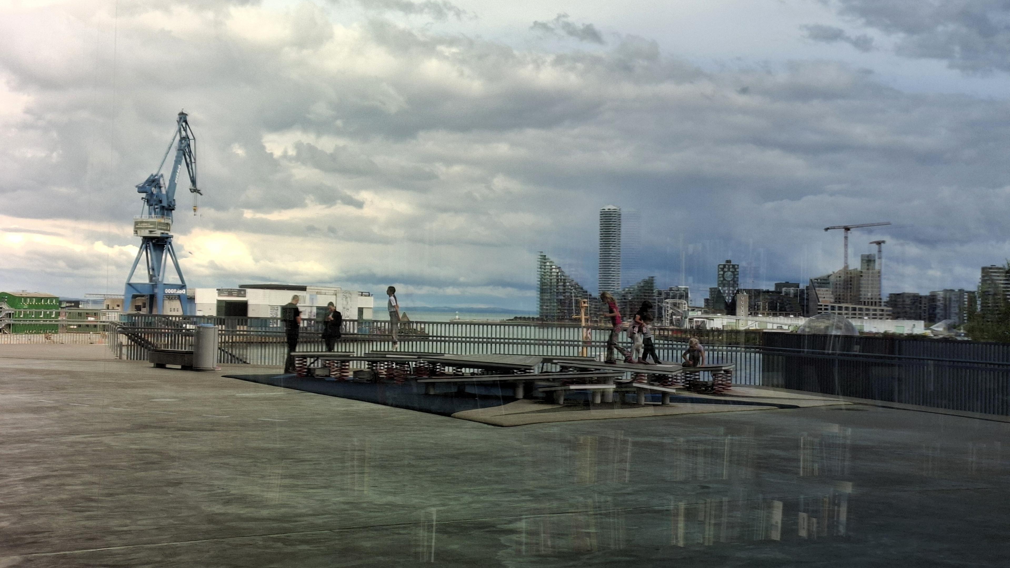 Short version: reflected in a window, a playground with harbour in background. Fuller description: looking in a huge picture window of Dokk1 Aarhus main library, Denmark, on an upper terrace. You canβt see the window edges, so it might not be obvious at first glance that this is a window. Inside, ghostly, indistinct in interior darkness, almost as if floating: rows of books on barely visible shelves. Overlaying them in the window, the full reflection of the scene behind us β the city and harbour. We can see a 75-metre tall industrial crane, angular like a blue iron giraffe; Denmarkβs tallest building, the narrow rectangular 142-metre tall Lighthouse apartment block; an A-shaped apartment block; a 70-metre high apartment block with a giant clock; calm light blue sea; overcast sky swirling with black and white clouds. On the terrace: playground platforms with indistinct figures of children walking and hopping and playing on them β one child is in mid-air, mid-hop.