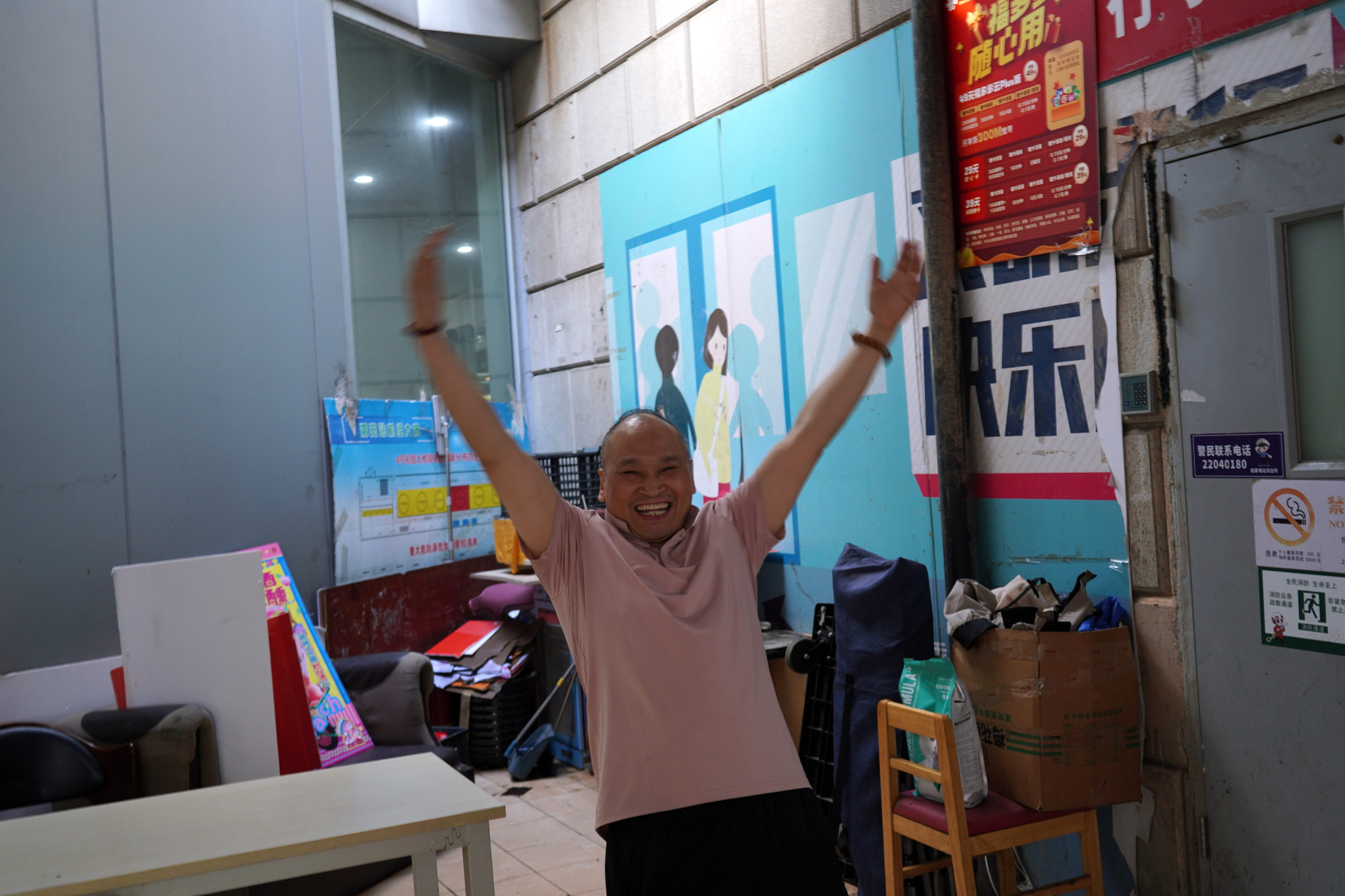 Street vendor in Shanghai with arms outstretched celebrating the morning and posing for me.