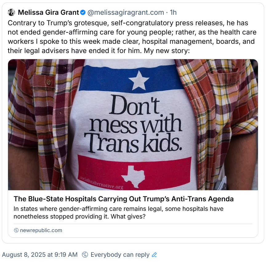 Melissa Gira Grant @melissagiragrant.com · 1h Contrary to Trump’s grotesque, self-congratulatory press releases, he has not ended gender-affirming care for young people; rather, as the health care workers I spoke to this week made clear, hospital management, boards, and their legal advisers have ended it for him. My new story: The Blue-State Hospitals Carrying Out Trump’s Anti-Trans Agenda In states where gender-affirming care remains legal, some hospitals have nonetheless stopped providing it. What gives?