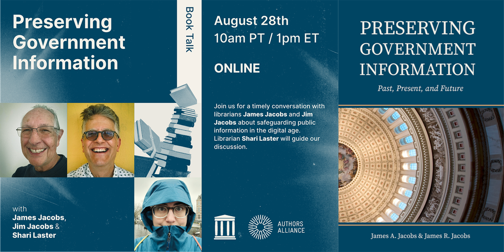 Promotional image. Features photos of James Jacobs, Jim Jacobs, and Shari Laster, the cover of the book Preserving Government Information: Past Present, and Future, and the logos of the Internet Archive and Authors Alliance. Text on image reads: Book Talk. Preserving Government Information, with James Jacobs, Jim Jacobs, and Shari Laster. August 28th, 10 am Pacific Time, 1 pm Eastern Time. Online. Join us for a timely conversation with librarians James Jacobs and Jim Jacobs about safeguarding public information in the digital age. Librarian Shari Laster will guide our discussion.