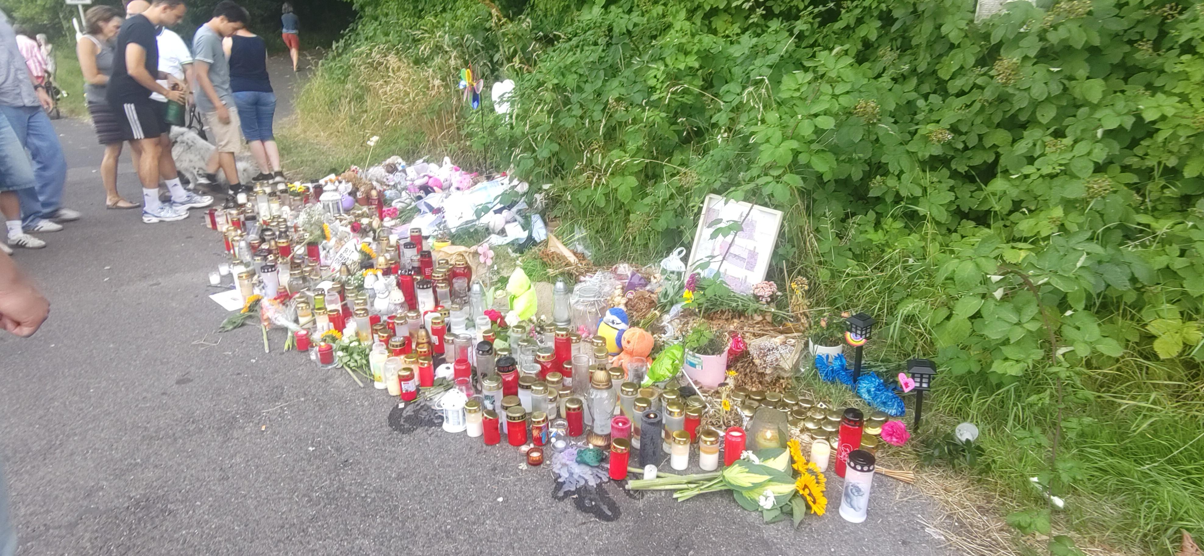 รber mehrere Meter sind Andenken, Blumen, Schriftstรผcke, (Grab)kerzen u.a. auf dem Wegrand verteilt.