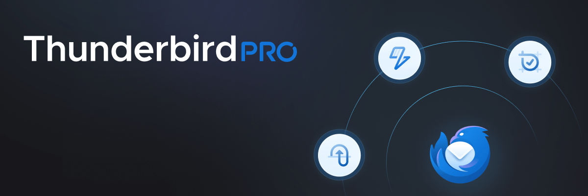 Logo and name of Thunderbird Pro with three circular icons representing features, all on a dark gradient background.
