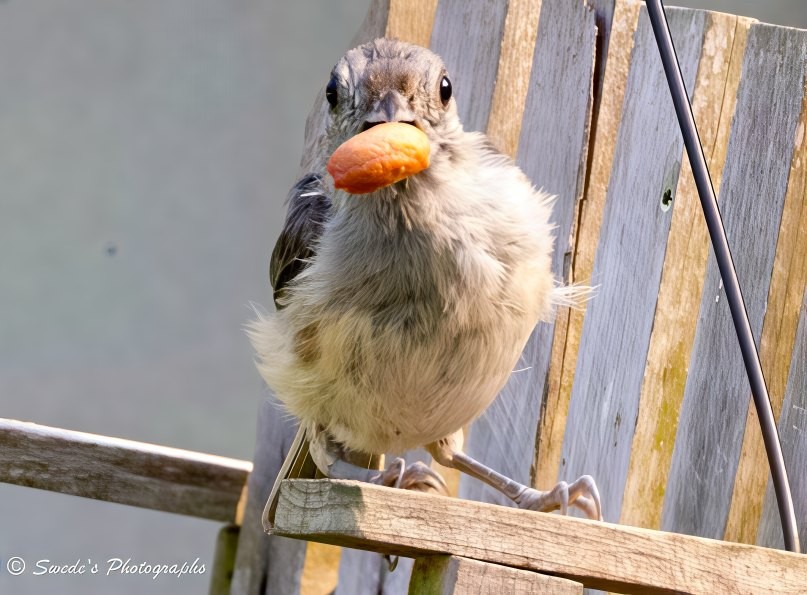 "A tufted titmouse—crestless and composed—perches on a weathered wooden rail, its tiny feet gripping the textured surface with quiet assurance. The bird’s head is smooth and rounded, lending it a gentle, unassuming profile. Its feathers are a soft blend of slate gray along the back and wings, with a clean white belly that catches the ambient light like a patch of snow. Its gaze is striking dark, round eyes stare directly into the camera with a mix of curiosity and quiet intensity, as if sizing up the viewer. Clutched in its small, pointed beak is a shelled peanut, the pale tan of the exposed nutmeat wrapped in a thin, papery skin. The peanut’s surface is slightly wrinkled and matte, a subtle contrast to the bird’s sleek plumage. The background is a soft blur of muted browns and greens, likely distant foliage rendered indistinct by shallow depth of field. This visual hush isolates the titmouse in a moment of intimate stillness, drawing all attention to its poised form and the simple treasure it holds. The wooden rail beneath it—perhaps part of a fence or garden structure—adds a rustic, tactile element to the scene. In the bottom left corner, the text “© Swede’s Photographs” is gently inscribed, anchoring the image in authorship without distracting from the subject." - Copilot with edits