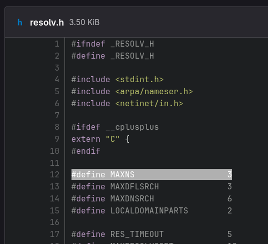 A screenshot of the resolv.h source code with the line highlighted "#define MAXNS 3"