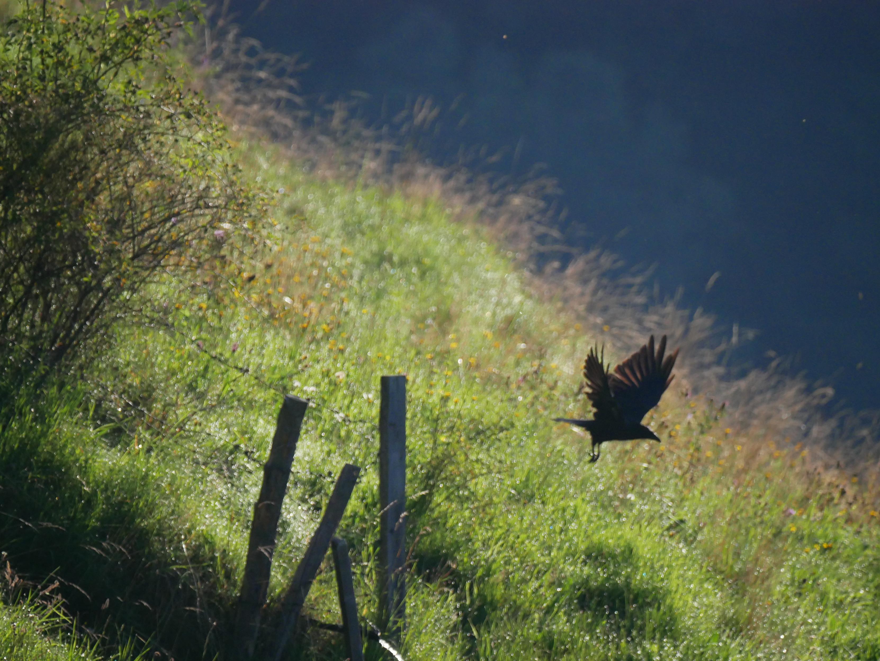 Foto einer schrägen Bergwiese mit einem Zaun samt Holz-Pfosten im Vordergrund, dahinter lange, ungemähte Wiese. Rechts im Bild fliegt gerade eine schwarze, große Krähe mit ausgebreiteten Flügeln davon, sie wird von hinten von der Sonne beleuchtet, einzelne Federn ihrer Flügel sind gut erkennbar.