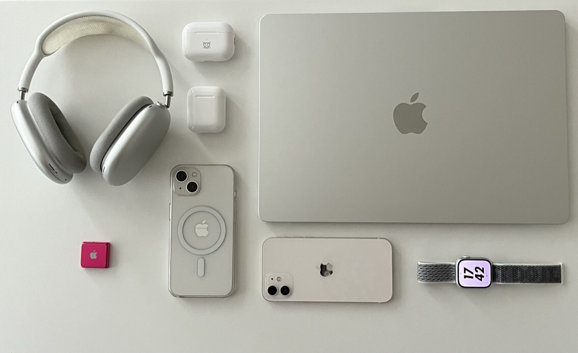 All my Apple products shown neatly - AirPods Max - AirPods Pro (2nd) - AirPods (2nd) - iPod shuffle - iPhone 13 - iPhone 12 - Apple Watch S8 - MacBook Air 15”
