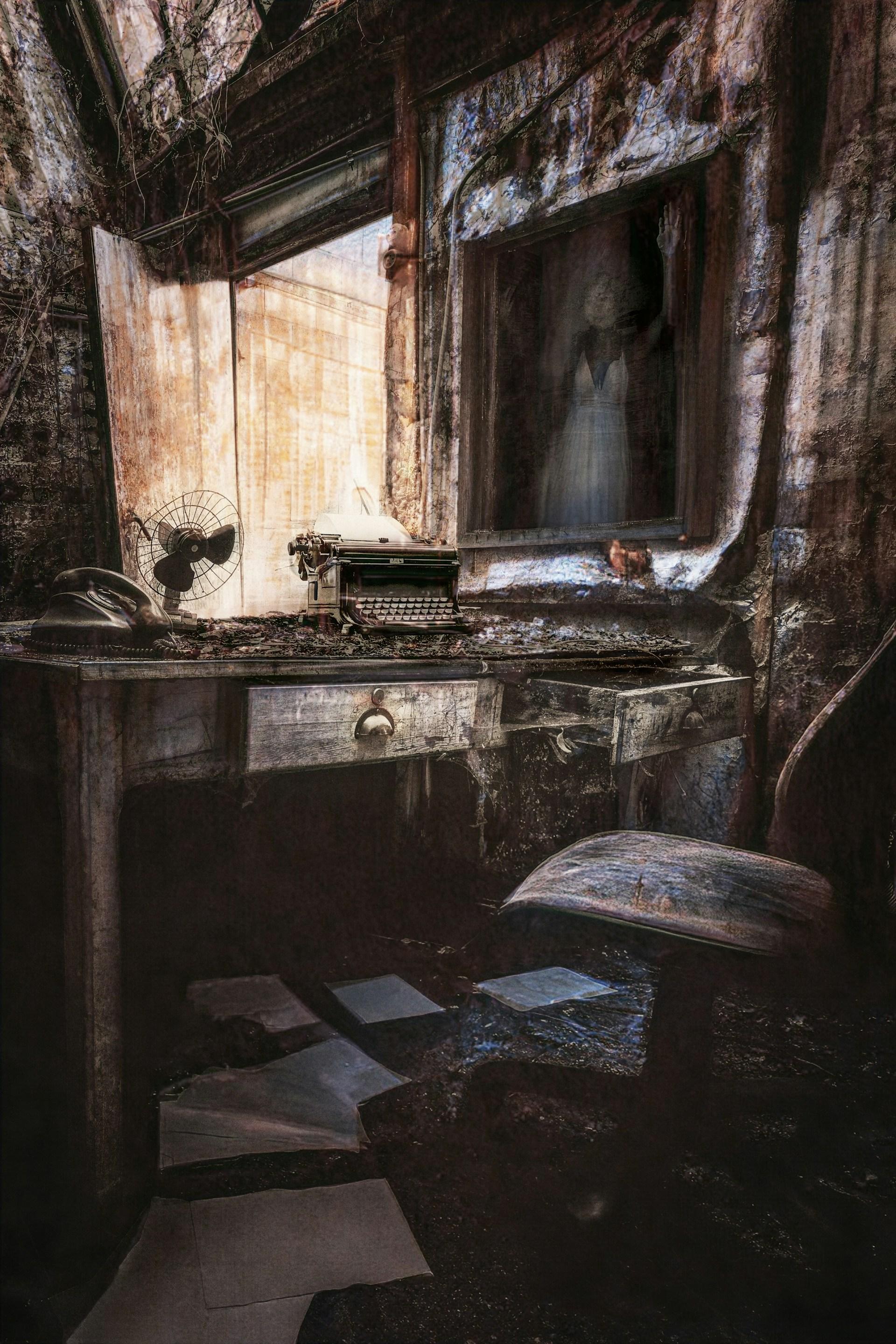 Eine Arbeitsstube oder Privatbüro, verlassen, verfallen, in Graubrauntönen gehalten. Schubladen sind teilweise aufgezogen, eine alte Schreibmaschine, ein altes Telefon und ein Ventilator auf dem Tisch. An der Wand ein eher beunruhigendes Bild einer Person in weißem Kleid oder Nachthemd. Papiere auf dem Boden. Insgesamt eher unheimlich.