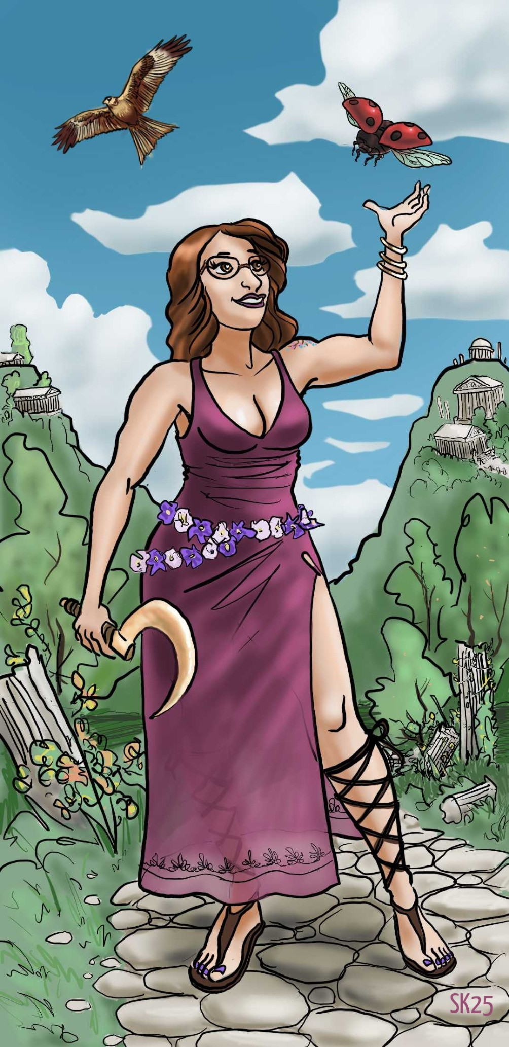 Cartoon drawing of me standing amongst overgrown marble pillars, Greek temples on the hills behind me. I'm wearing a slightly translucent purple halter-neck dress with a high slit at the thigh, low neckline, and floral pattern at the hem, and high-laced Greek sandals. I have bangles around my left wrist and a bronze sickle in my right hand, held loosely at my side. Around my waist is a garland of the cream and violet flowers of potato and nightshade. The sky above me is blue with clouds, where a kite wheels overhead. I am reaching up with my left hand towards an outsized ladybird beetle fluttering above me, a calm smile on my face. You can just about make out the cherry blossom tattoo on my left shoulder.