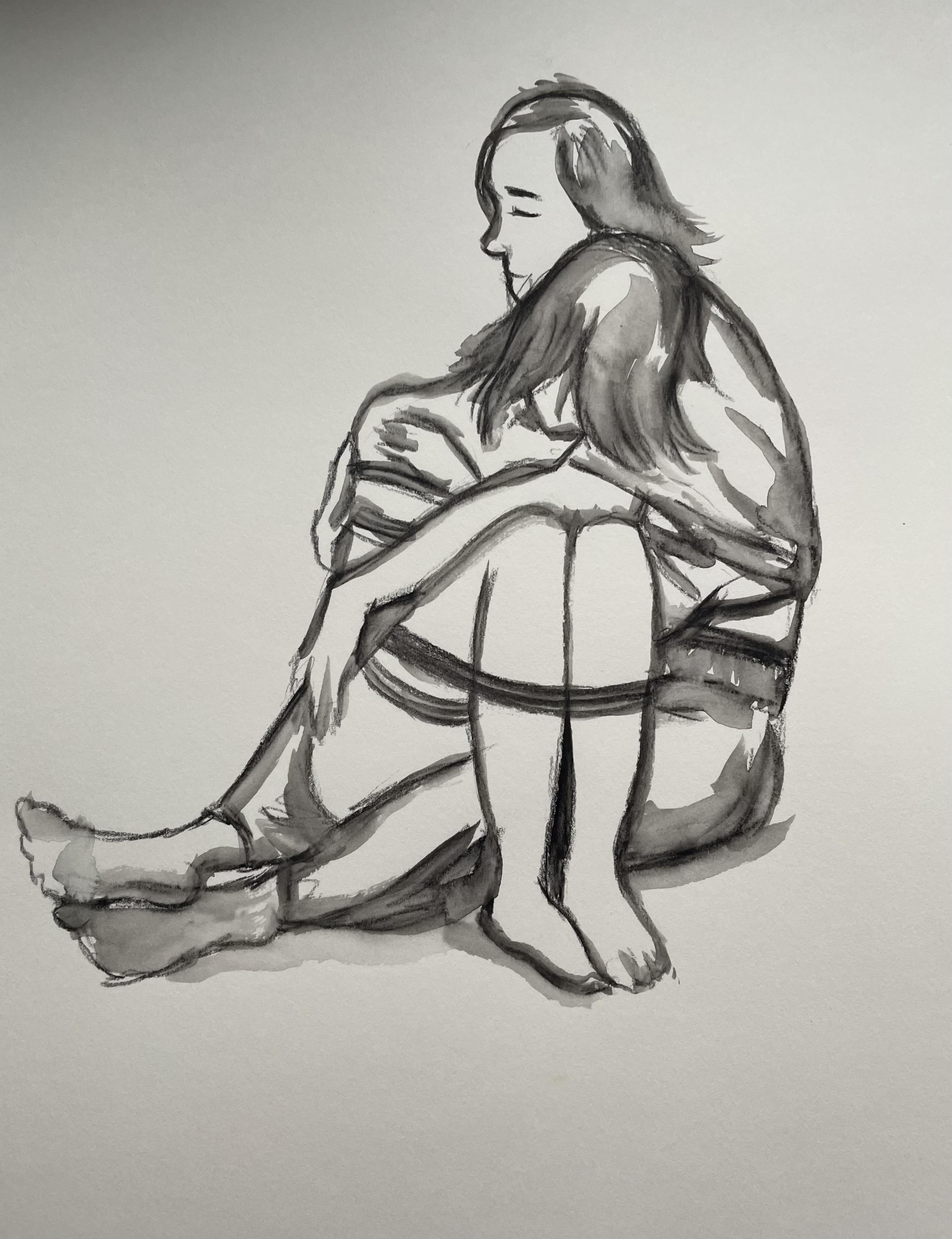 A figure drawing of a nonbinary person tied with rope leaning on their partner and sitting in their lap. Their hair obscures their face.