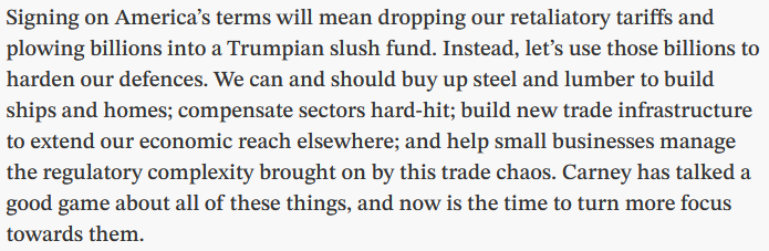 Excerpt from linked opinion piece reading: "Signing on Americaβs terms will mean dropping our retaliatory tariffs and plowing billions into a Trumpian slush fund. Instead, letβs use those billions to harden our defences. We can and should buy up steel and lumber to build ships and homes; compensate sectors hard-hit; build new trade infrastructure to extend our economic reach elsewhere; and help small businesses manage the regulatory complexity brought on by this trade chaos. Carney has talked a good game about all of these things, and now is the time to turn more focus towards them."