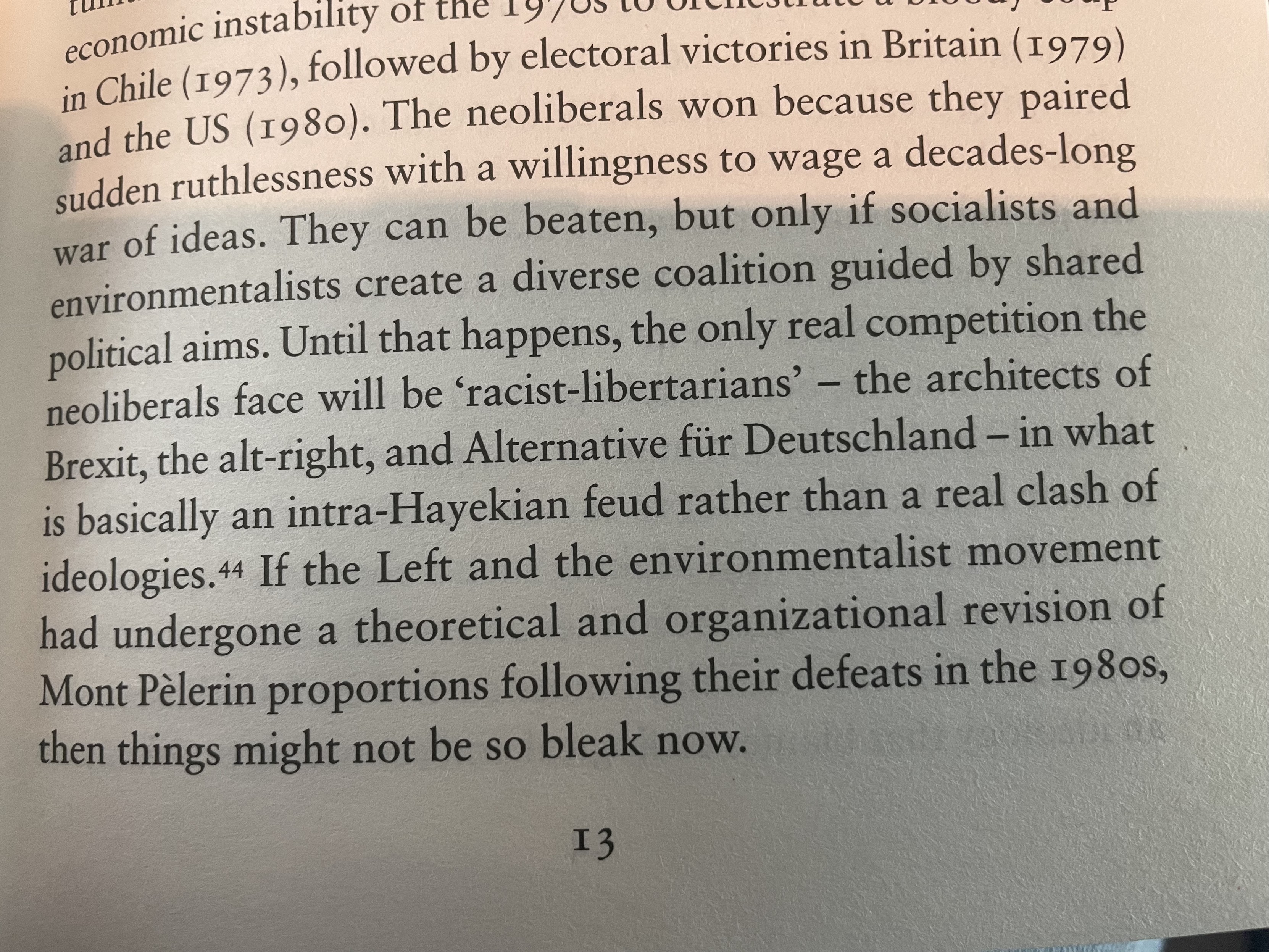 A close-up photo of a printed book page with text regarding political and economic history, mentioning electoral victories in Britain in 1979, the rise of neoliberalism, and the challenges faced by the Left and environmentalist movement.