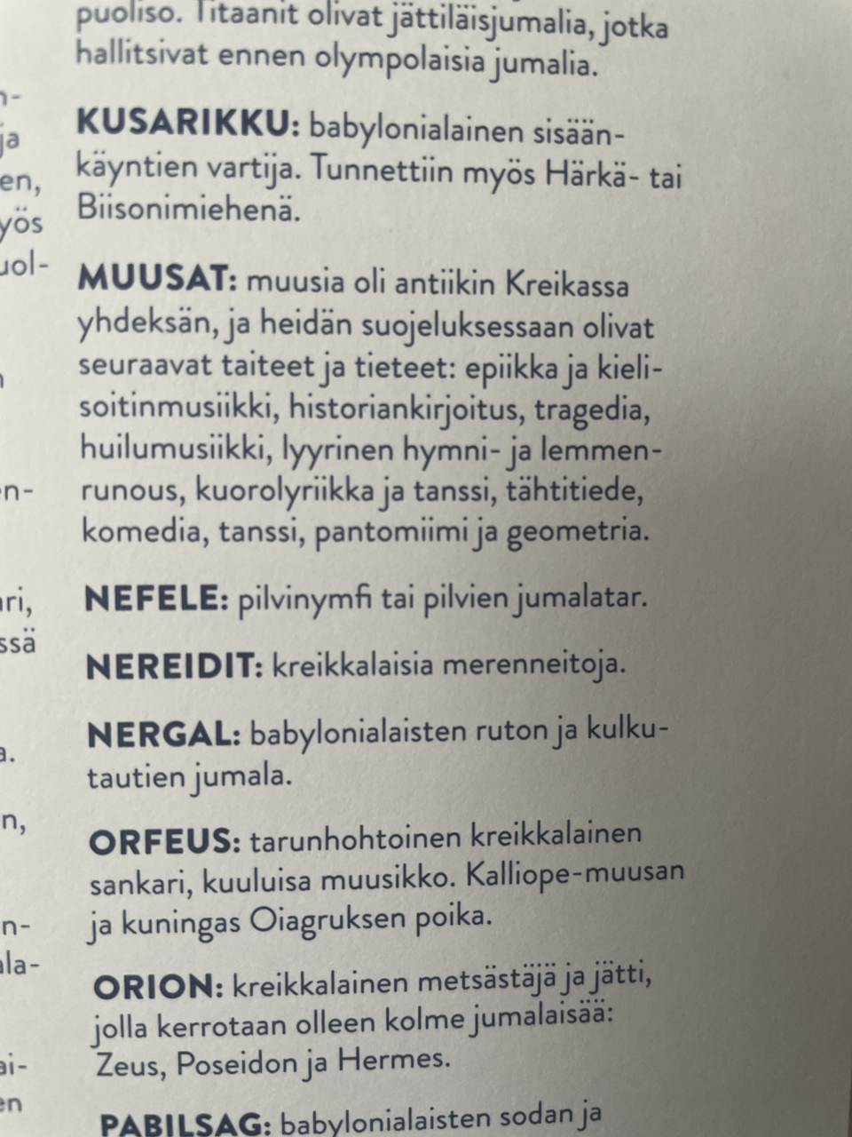 Myyttisten hahmojen henkilöhakemisto kohdasta K-P. M mainitaan vain Muusat. alla koko kuvan teksti. KUSARIKKU: babylonialainen sisään- käyntien vartija. Tunnettiin myös Härkä- tai Biisonimiehenä. MUUSAT: muusia oli antiikin Kreikassa yhdeksän, ja heidän suojeluksessaan olivat seuraavat taiteet ja tieteet: epiikka ja kieli- soitinmusiikki, historiankirjoitus, tragedia, huilumusiikki, lyyrinen hymni- ja lemmen- runous, kuorolyriikka ja tanssi, tähtitiede, komedia, tanssi, pantomiimi ja geometria. NEFELE: pilvinymfi tai pilvien jumalatar. NEREIDIT: kreikkalaisia merenneitoja. NERGAL: babylonialaisten ruton ja kulku- tautien jumala. ORFEUS: tarunhohtoinen kreikkalainen sankari, kuuluisa muusikko. Kalliope-muusan ja kuningas Oiagruksen poika. ORION: kreikkalainen metsästaja ja jätti, jolla kerrotaan olleen kolme jumalaisaa: Zeus, Poseidon ja Hermes. PABILSAG: babylonialaisten sodan ja