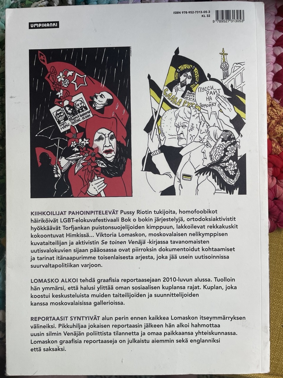 KIIHKOILIJAT PAHOINPITELEVÄT Pussy Riotin tukijoita, homofoobikot häiriköivät LGBT-elokuvafestivaali Bok o bokin järjestelyjä, ortodoksiaktivistit hyökkäävät Torfjankan puistonsuojelijoiden kimppuun, lakkoilevat rekkakuskit kokoontuvat Himkissä... Viktoria Lomaskon, moskovalaisen nelikymppisen kuvataiteilijan ja aktivistin Se toinen Venäjä -kirjassa tavanomaisten uutisvalokuvien sijaan pääosassa ovat piirroksin dokumentoidut kohtaamiset ja tarinat itänaapurimme toisenlaisesta arjesta, joka jää usein utisoinnissa suurvaltapolitiikan varjoon. LOMASKO ALKOI tehdä graafisia reportaasejaan 2010-luvun alussa. Tuolloin hän ymmärsi, että halusi littää oman sosiaalisen kuplansa rajat. Kuplan, joka koostui keskusteluista muiden taiteilijoiden ja suunnittelijoiden kanssa moskovalaisissa gallerioissa. REPORTAASIT SYNTYIVÄT alun perin ennen kaikkea Lomaskon itseymmärryksen välineiksi. Pikkuhiljaa jokaisen reportaasin jälkeen hän alkoi hahmottaa uusin silmin Venäjän poliittista tilannetta ja omaa paikkaansa yhteiskunnassa. Lomaskon graafisia reportaaseja on julkaistu aiemmin sekä englanniksi että saksaksi.