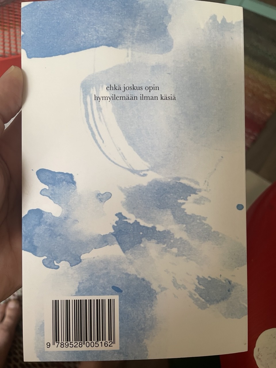 sama sinisävyinen vesiväri kuvitus. ”ehkä joskus opin hymyilemään ilman käsiä.”