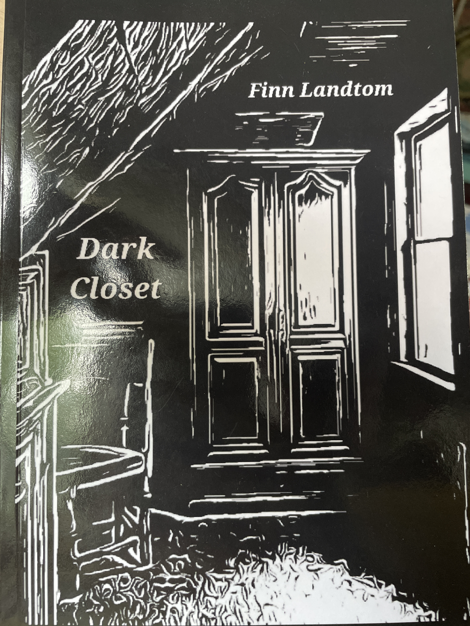 Mustavalkoinen kansi. Puupiirrosmainen hΓ€mΓ€rΓ€ huone jonka perΓ€llΓ€ iso vanhanaikainen kaappi.